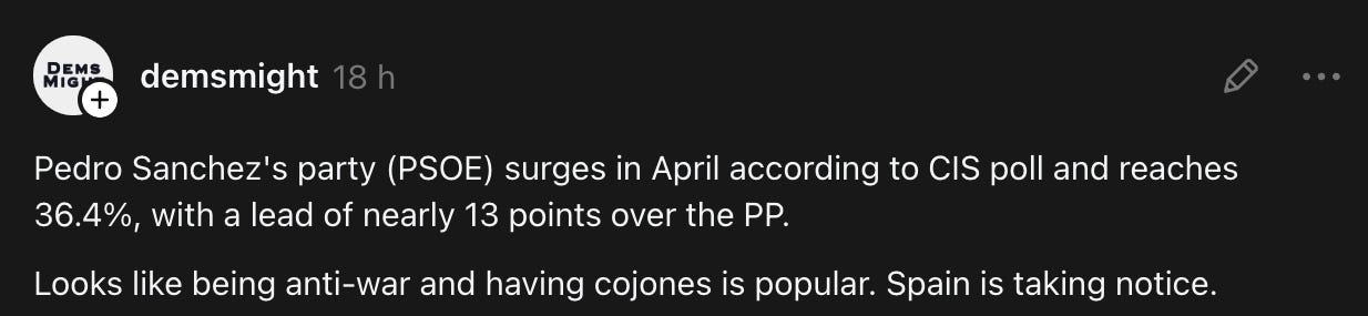 Aplausos (desde fuera). Las redes se llenaron de elogios, como el mensaje de DemsMight, un grupo pro-demócrata estadounidense: “Parece que ser anti-guerra y tener cojones es popular. España se está dando cuenta.”